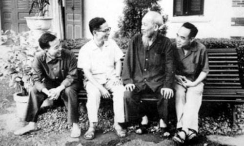 Từ phải qua: Nhà văn Trần Đình Vân, Bác Hồ, nhà văn Phan Tứ và nhà thơ Tố Hữu.